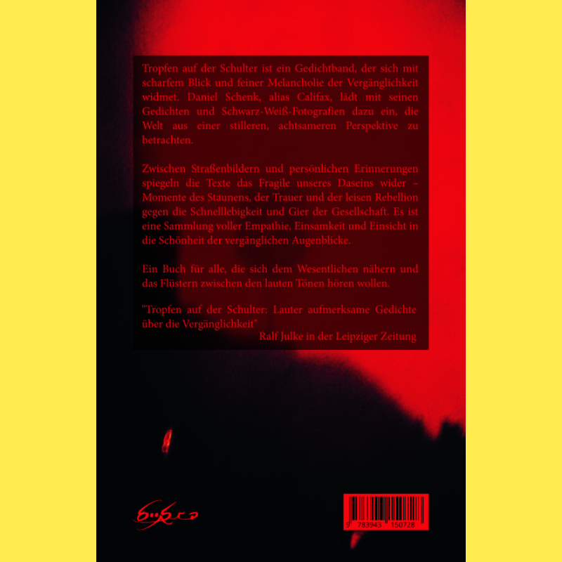 Tropfen auf der Schulter ist ein Gedichtband, der sich mit scharfem Blick und feiner Melancholie der Vergänglichkeit widmet. Daniel Schenk, alias Califax, lädt mit seinen Gedichten und Schwarz-Weiß-Fotografien dazu ein, die Welt aus einer stilleren, achtsameren Perspektive zu betrachten.